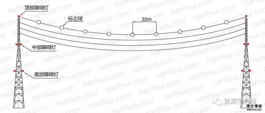 ①航空标记球安装在架空塔的防雷地线的钢缆上,必须等间距设置,其间距应与障碍灯的直径相适应;